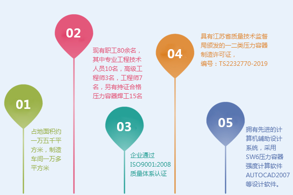 企業具有江蘇省質量技術監(jiān)督局頒發(fā)的一二類壓力容器制造許可證,編號:TS2232770-2019。 擁有計算機輔助設計系統,采用SW6壓力容器強度計算軟件,AutoCAD2007等設計軟件。